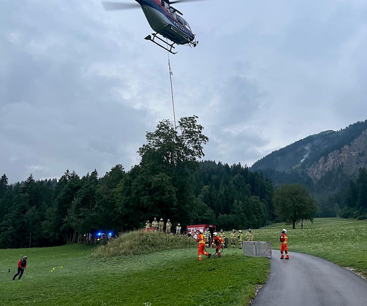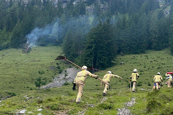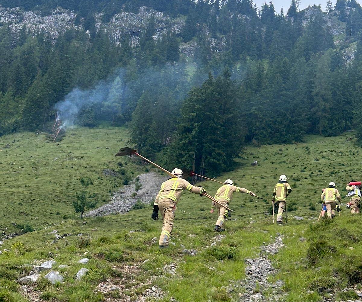 Am Abend des 06.07.2025 wurde die Feuerwehr Fieberbrunn über Sirene und Sammelruf zu einem Brand im Freien oberhalb der Rohreralm alarmiert. Bereits auf der Anfahrt wurde klar, dass sich der Brand in sehr unwegsamem Gelände befand und keine direkte Zufahrt zum Brandobjekt möglich war.