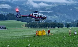 Durch die zunehmende Dunkelheit und den aufziehenden Nebel gestaltete sich die Brandbekämpfung zunehmend schwierig. Mehrere Rotationen waren notwendig, um einen Flughelfer, Material und Löschwasser mit dem Bambi Bucket zur Brandstelle zu bringen.