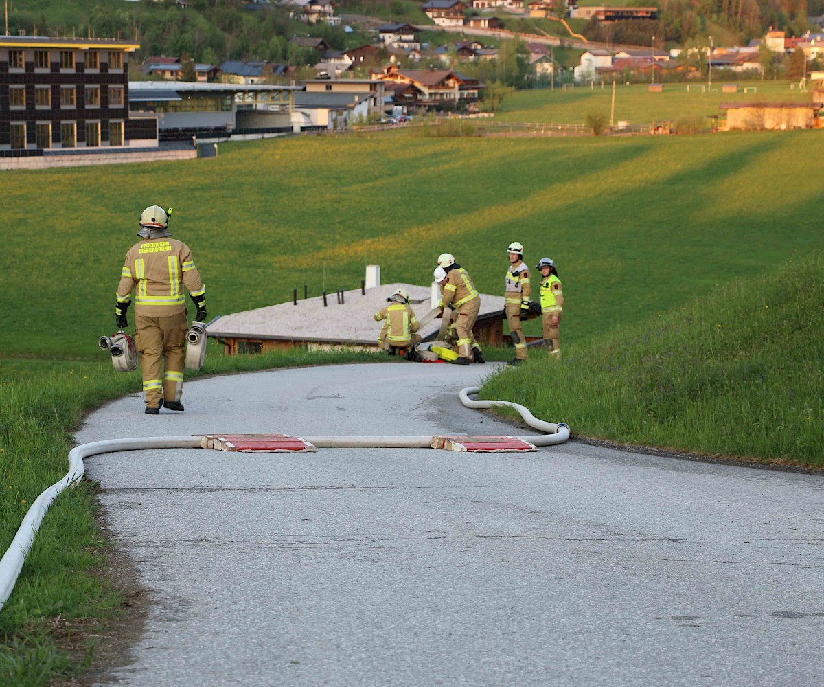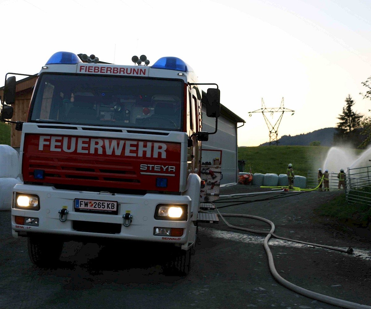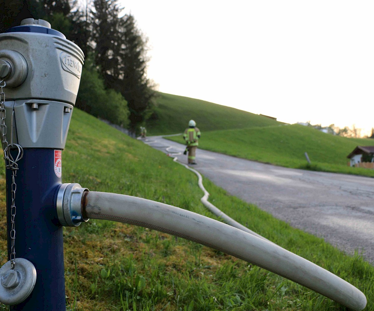 Zur Sicherstellung einer ausreichenden Löschwasserversorgung wurden zwei unabhängige Speiseleitungen aufgebaut – eine vom nächstgelegenen Hydranten sowie eine weitere von einer Saugstelle an der Fieberbrunner Großache. Hierbei kamen auch die beiden Löschfahrzeuge sowie das Lastfahrzeug mit dem Schlauchbuchtensystem zum Einsatz.