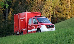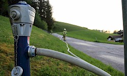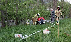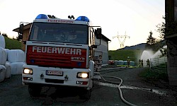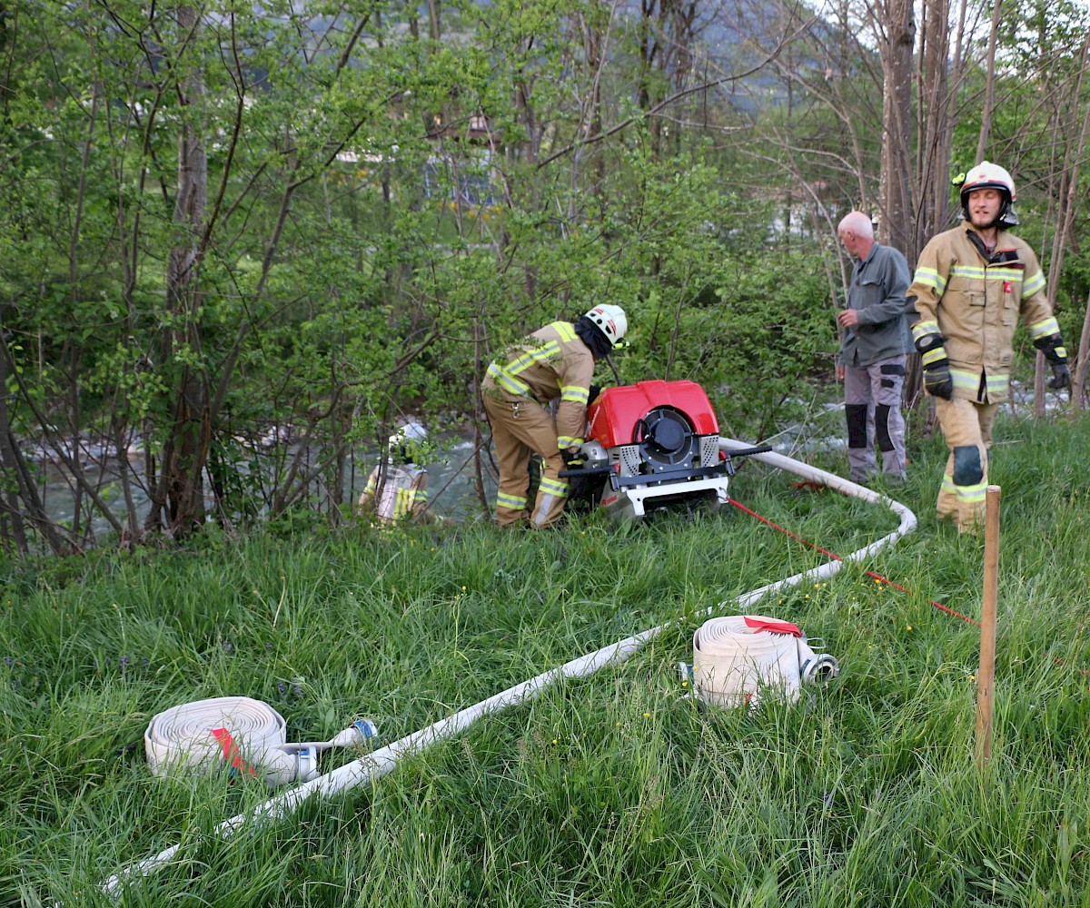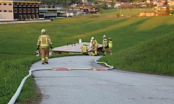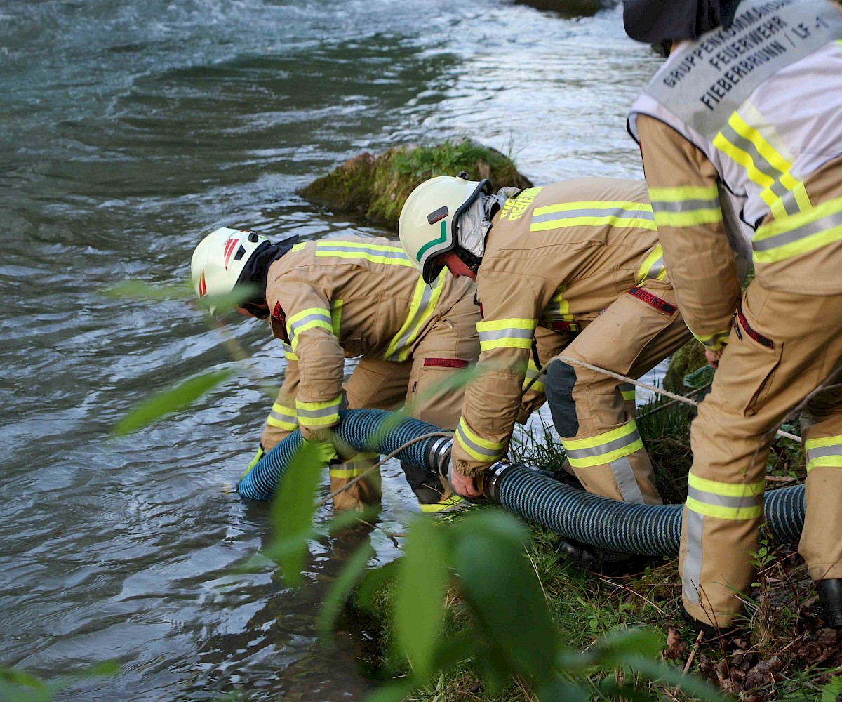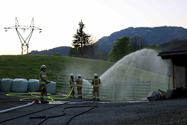 Zur Sicherstellung einer ausreichenden Löschwasserversorgung wurden zwei unabhängige Speiseleitungen aufgebaut – eine vom nächstgelegenen Hydranten sowie eine weitere von einer Saugstelle an der Fieberbrunner Großache. Hierbei kamen auch die beiden Löschfahrzeuge sowie das Lastfahrzeug mit dem Schlauchbuchtensystem zum Einsatz.
