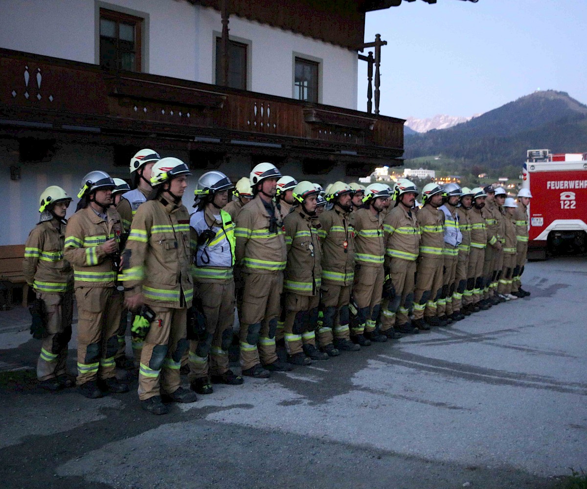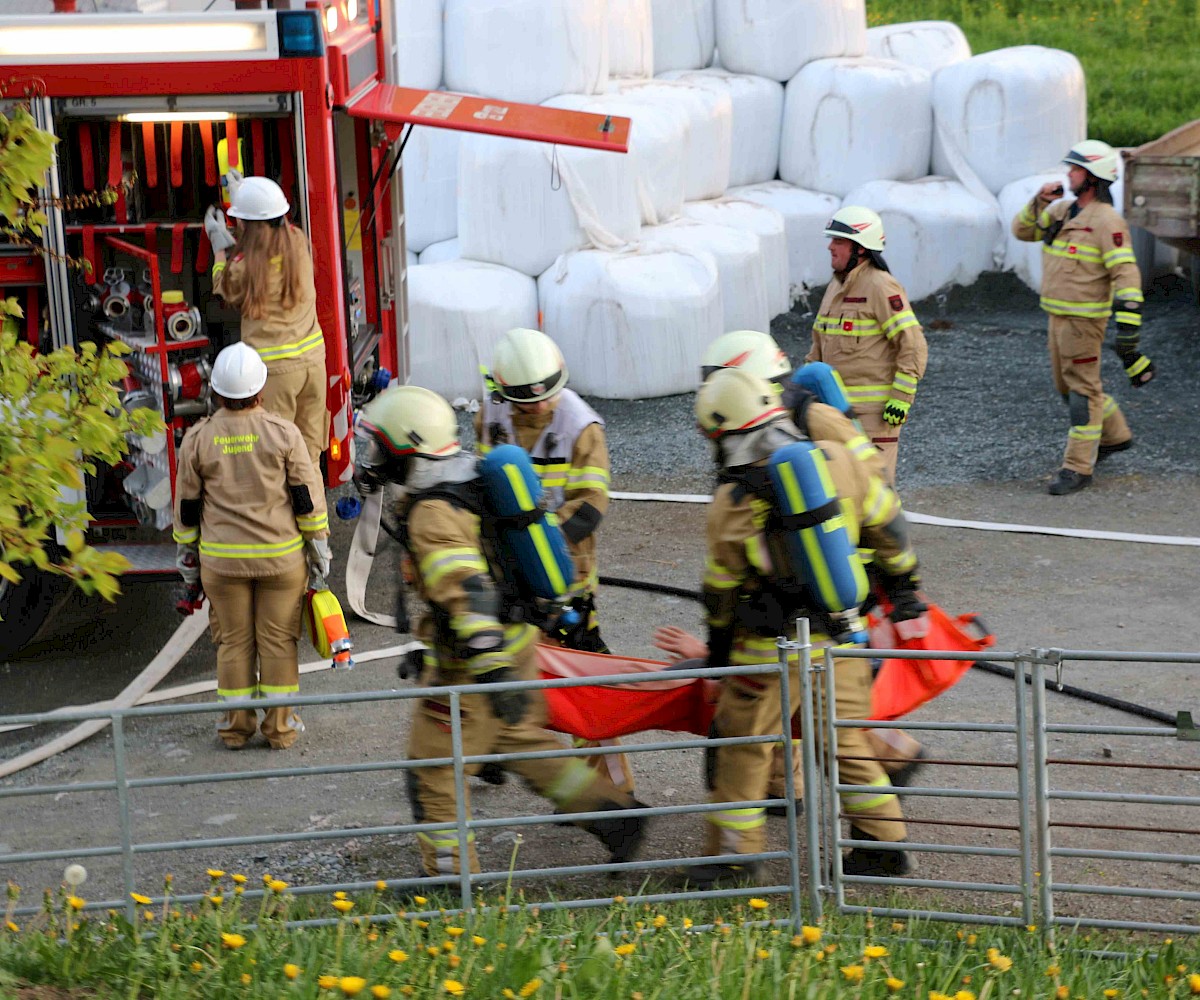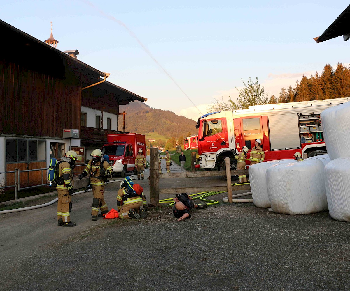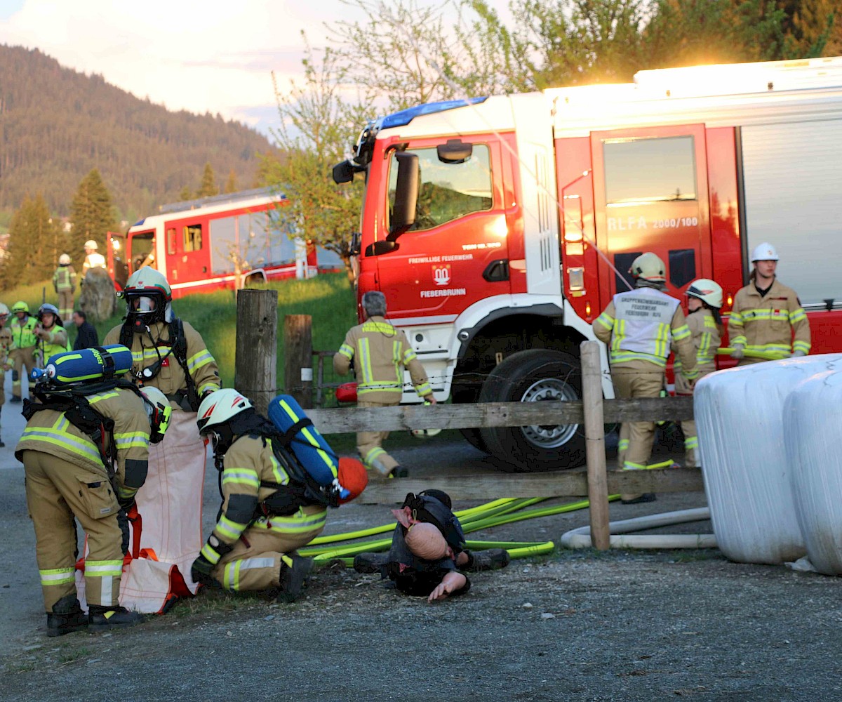 Am 29.04.2025 fand die alljährliche Florianiübung der Freiwilligen Feuerwehr Fieberbrunn statt. Übungsannahme war ein Scheunenbrand, verursacht durch Flämmarbeiten, bei dem sich ein Arbeiter auf dem Dach befand und eine weitere Person im Inneren der stark verrauchten Scheune eingeschlossen war.