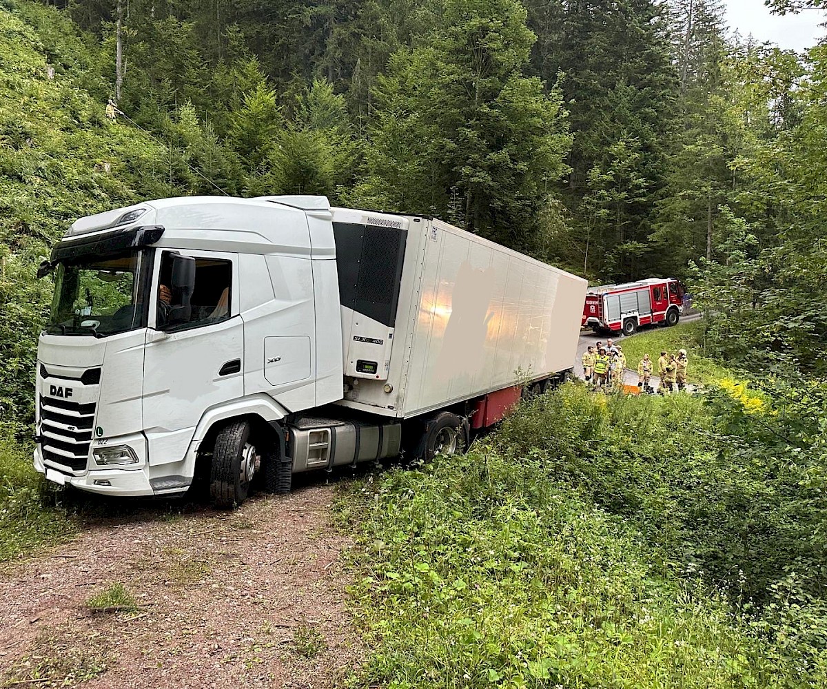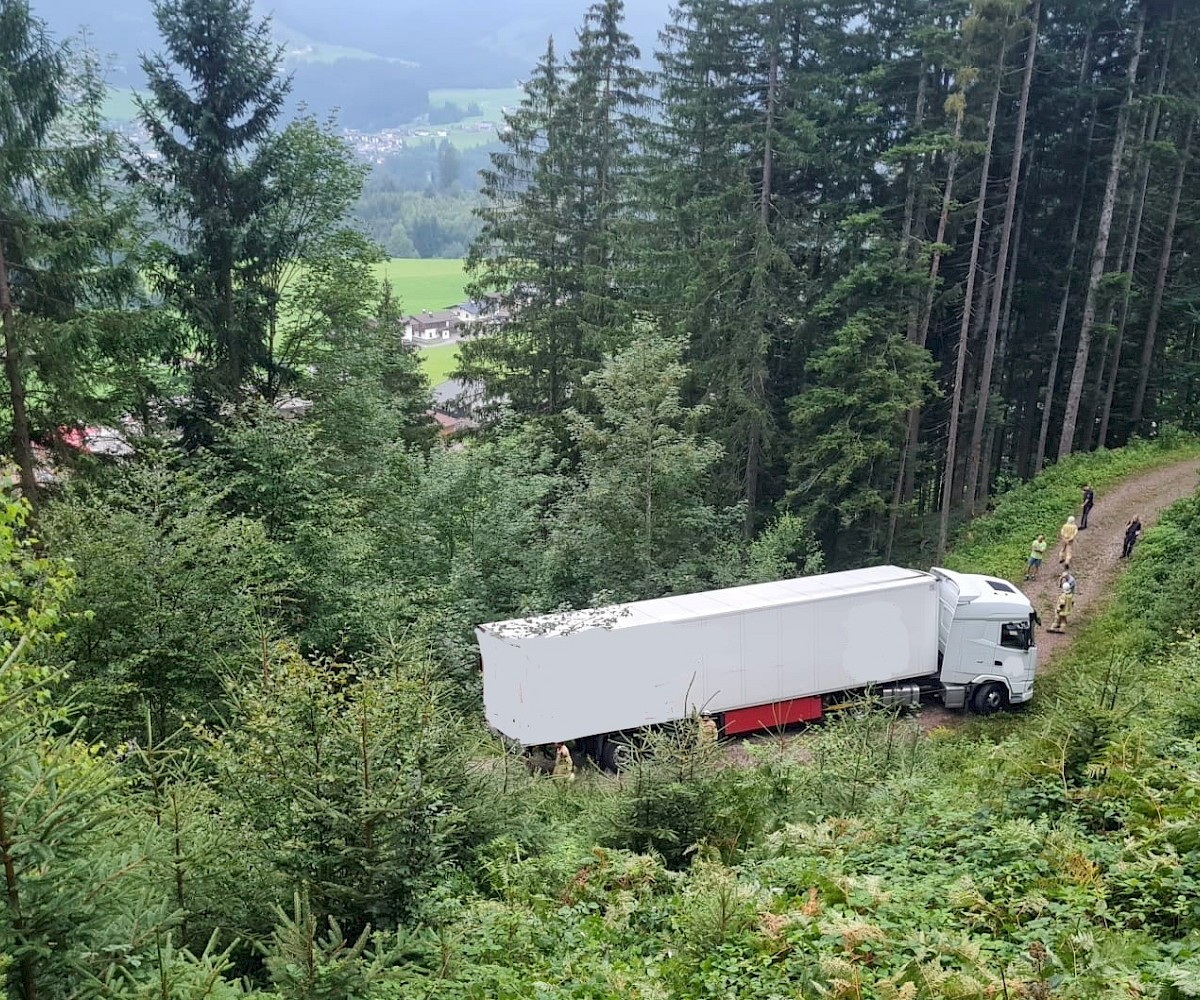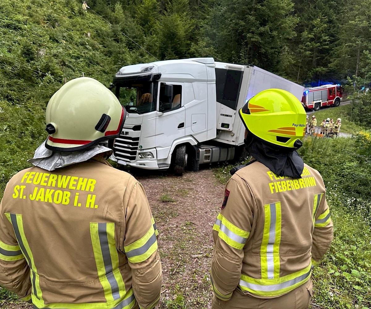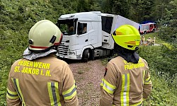 Nachalarmierung nach St.Jakob zu einem drohenden LKW Absturz. Nach der Sicherung mit mehreren Hubzügen und dem Herstellen einer sicheren Lage wurde der Einsatz nach ca. einer Stunde beendet. Der LKW wird heute im Laufe des Tages durch eine Spezialfirma geborgen.