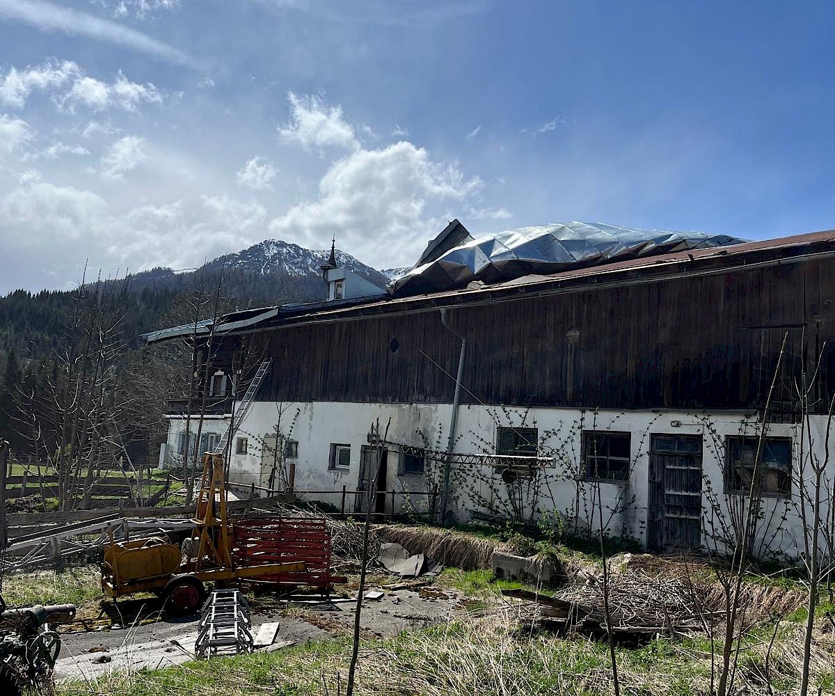 Aufgrund des heftigen Föhnsturms wurde die Feuerwehr Fieberbrunn am 17.04.2025 zu einem abgedeckten Blechdach bei einem Bauernhof alarmiert. Durch den starken Sturm war ein Aufstieg auf das Dach zu gefährlich, weshalb das Dach von unten gegen ein weiteres Abdecken gesichert wurde. Die Einsatzstelle wurde durch uns noch abgesichert.